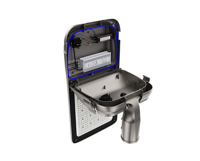 The VLCA series LED city street lights have a simple and elegant appearance, with 4 sizes, supporting horizontal and vertical installation, power of 30-240W, luminous efficiency of up to 176lm/W, and multiple light distribution options to meet different lighting needs and installation environments. The whole lamp is composed of high-pressure die-cast aluminum and UV-treated tempered glass. The spring latch design allows the lamp body to be disassembled without tools, making it easy to replace and upgrade in the later maintenance. The standard knife switch can automatically cut off the power supply to ensure the personal safety of the installers during the maintenance process. The lamps can be equipped with 1-10V/DALI dimming, NEMA, Zhaga, photoelectric sensors, motion sensors, Zigbee/Lora sockets for intelligent control systems or future upgrades.
